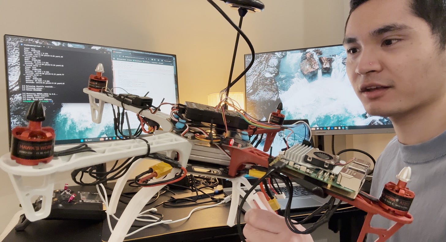 Proud moment in my autonomous AI drone build! Problem: I installed an edge computer on the drone so that the AI models could control it. However, power supply was still an issue. The computer needed to pull from the same battery source as that of the drone (instead of an external power source) so that they could all fly together in one piece. I have no formal training in electricity, but I wired a bunch of random stuff together (including cut up iPhone cables) and it worked! The computer didn't fry and no fire extinguisher needed, phew.